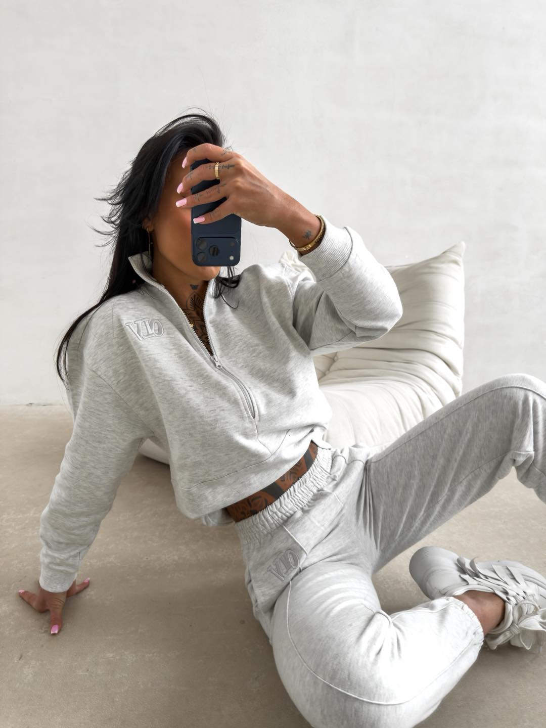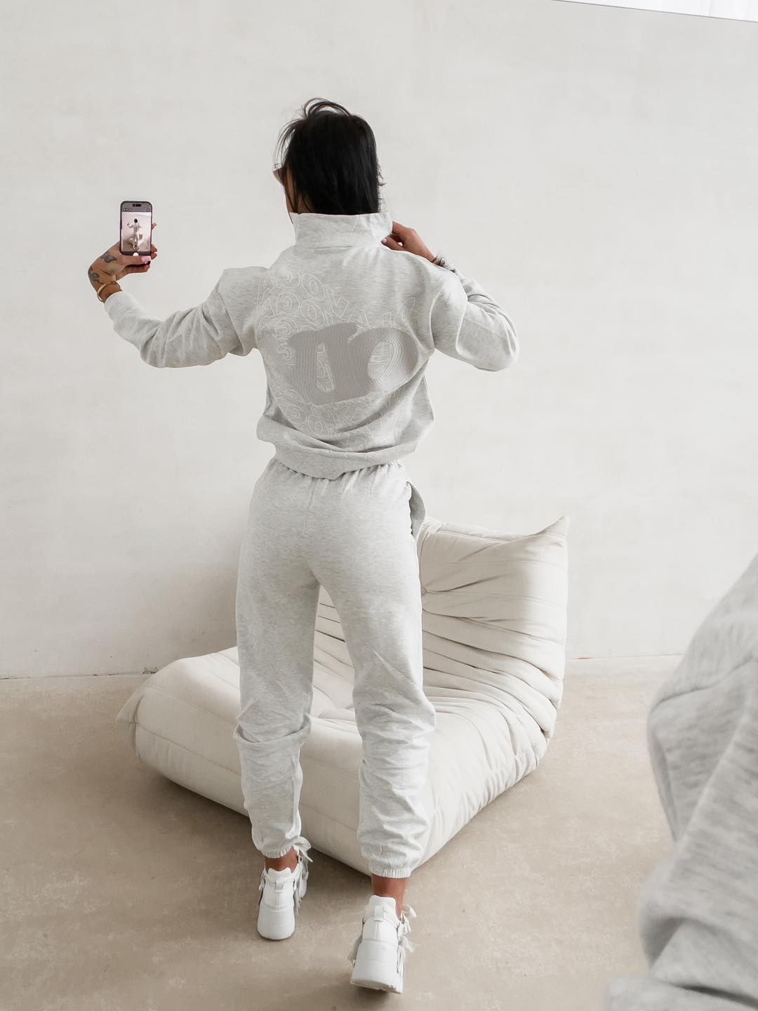 Felső (Pulóver): Laza, oversize fazon magasított, cipzáras gallérral. Az elején diszkrét OLV hímzés látható. A pulóver igazi különlegessége a hátoldala: egy látványos, térhatású 3D „OLV” hímzés, amely egy finom, tónusos „OLAVOGA” feliratú nyomaton helyezkedik el.
