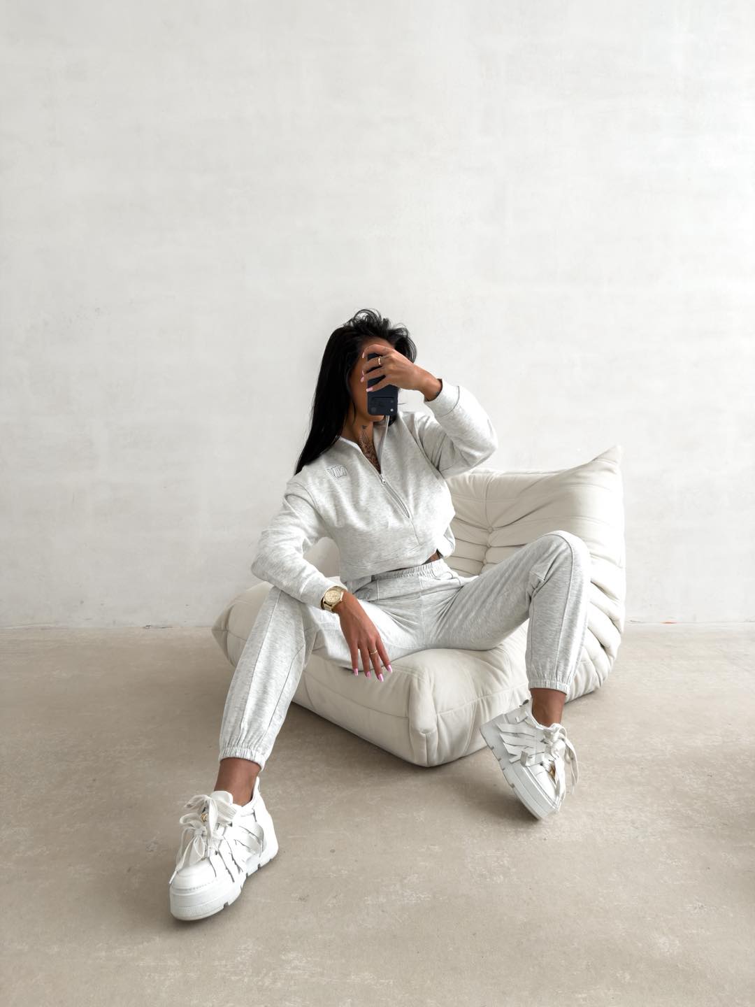 Ez a casual melegítő szett a legmagasabb minőségű, puha pamutból készült, amely valósággal körülöleli a testet. A modern, oversize szabás és az aprólékosan kidolgozott, térhatású részletek teszik ezt a szettet a kollekció egyik legexkluzívabb darabjává.